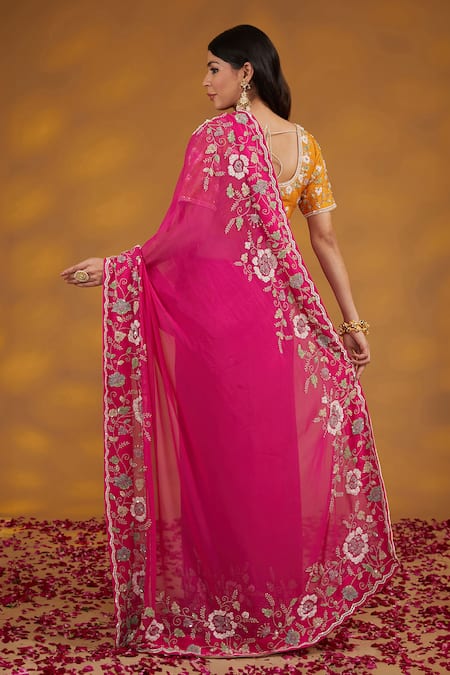 Pink georgette saree featuring hand embroidered floral patterns. Paired with a contrasting embroidered padded blouse with a back scoop cut-out and ornamented tassels.