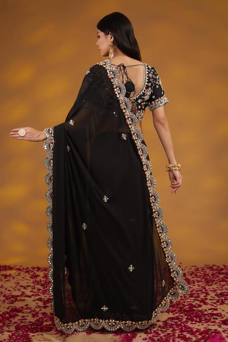 Black georgette saree featuring multi-colored floral and mirror work embroidery on scalloped border. Paired with a matching embroidered padded blouse and a belt.