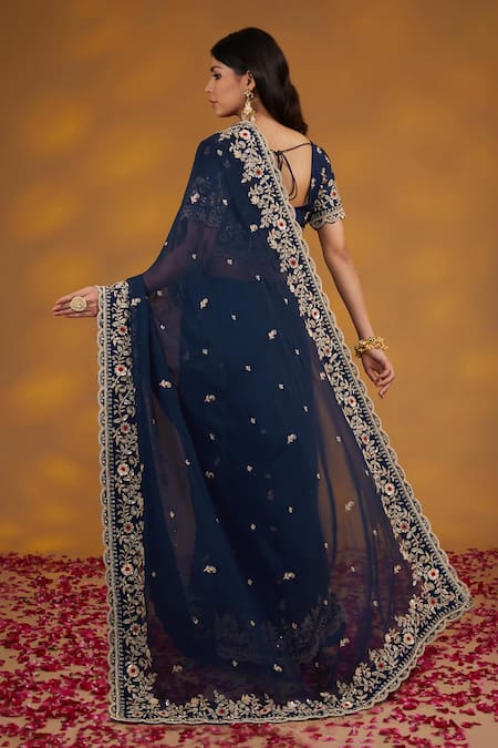 Blue saree crafted in georgette featuring hand embroidered floral patterns. Paired with a matching raw silk blouse with back scoop cut-out and ornamented tassels, along with a petticoat.