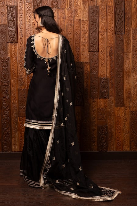 Black silk chanderi kurta featuring embroidered floral jaal patterns. Paired with an organza sharara and embroidered dupatta.