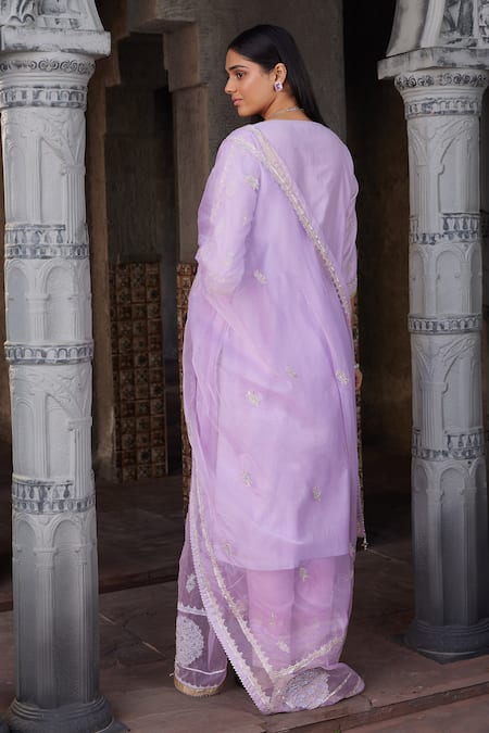 Purple kurta featuring floral and geometric embroidery with sequins and zari. Paired with a pant and a dupatta, both adorned with all-over embroidery.