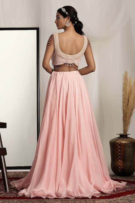 Pink Crepe, Silk, Net Pearls, Tassels Plunge Embroidered Blouse And Lehenga Set