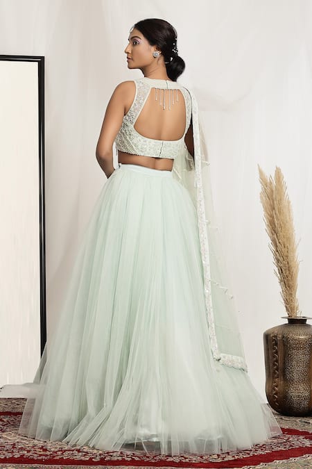 Green Net Pearls, Beads Round Neck Floral Embroidered Lehenga Set