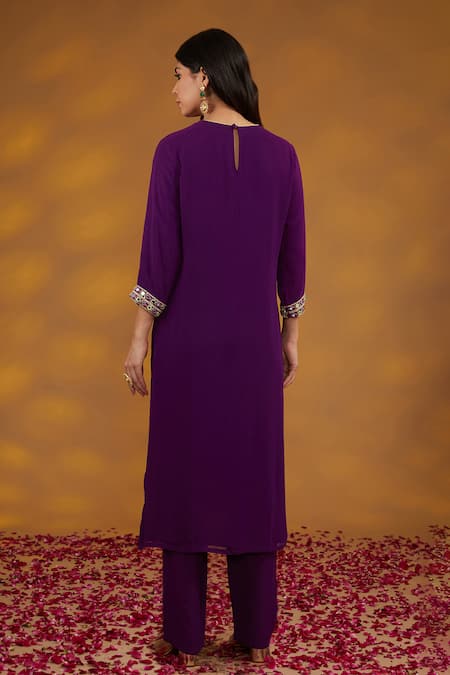 Purple georgette kurta featuring florence zardozi embroidery on the yoke and sleeves hem with mirror highlights. Paired with a solid straight pant and a dobby dupatta with lampi border embellishments.