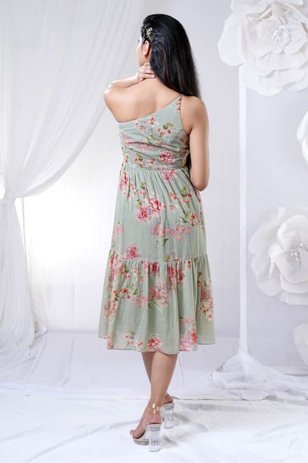 Green and pink floral printed midi dress featuring a one shoulder sleeve and tiered detailing