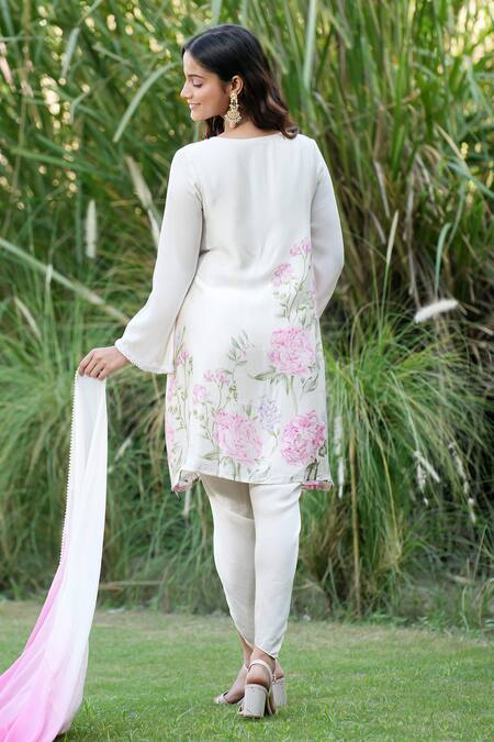 Buy_House Of TA-YA_Off White Modal, Satin Embroidery, Floral Blossom Print Kurta Dhoti Pant Set _at_Aza_Fashions
