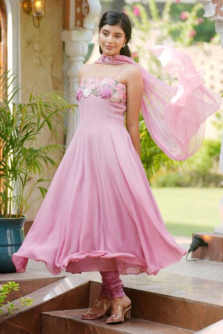 Floral thread embroidery on neckline, Panelled anarkali design, Chiffon dupatta with matching embroidery