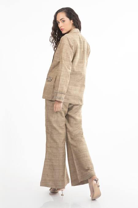 Macadamia beige cotton hessain structured blazer with fray details on the sleeves & embellished pocket flaps. Comes with blouse & bell bottom pant.