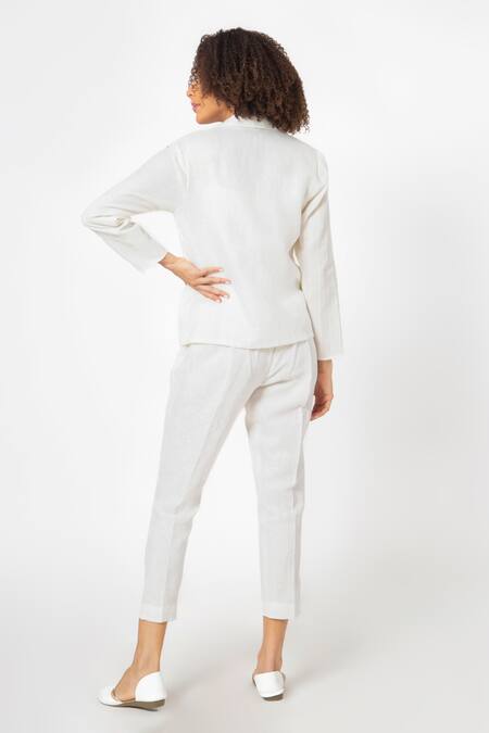 White Pure Linen Aari Work Inner Round, Jacket Notched Collar With Pant Set