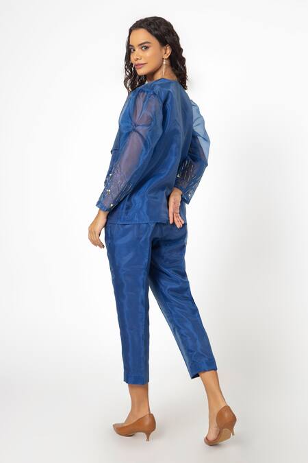Blue puffed sleeve jacket with aari embroidered flap pockets. Paired with straight pant.