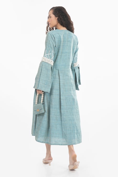 Blue Cotton Hessain Pearls Round Cleopatra Embellished Sleeve Dress