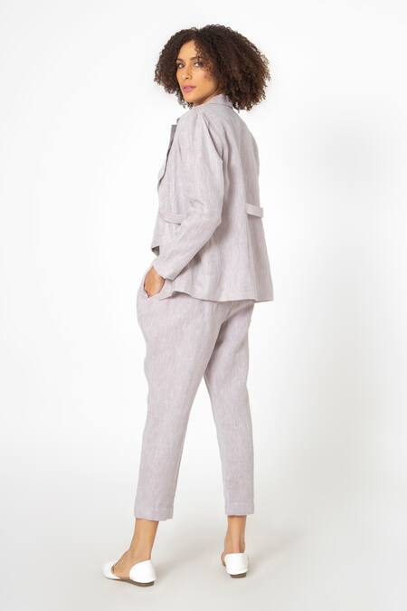Purple Pure Linen Aari Work Jacket Open, Waistcoat Notched Collar And Pant Set