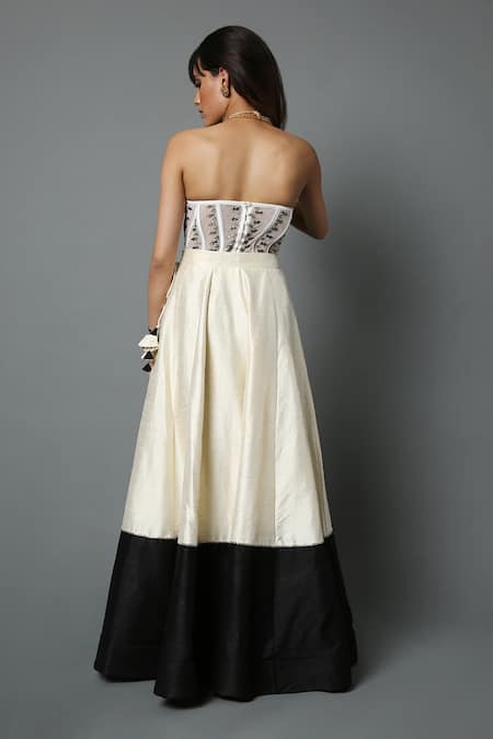 Off-white colour block dupion silk kalidar lehenga with black hem in hand embroidered glass bead detail.