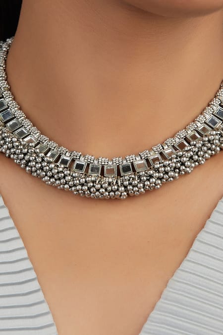 Silver toned choker featuring finely cut mirror embellishments and geometric shapes