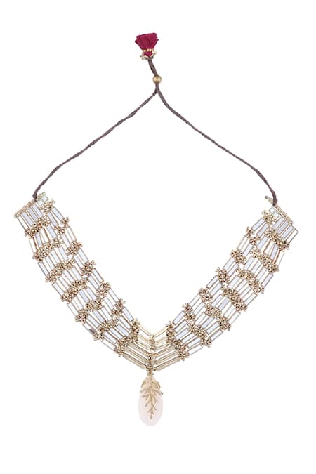 White choker necklace featuring quartz stone embellishments and mirror chain links