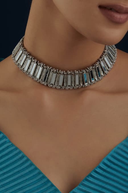 Silver tone choker featuring fine cut mirror embellishments and geometric pattern