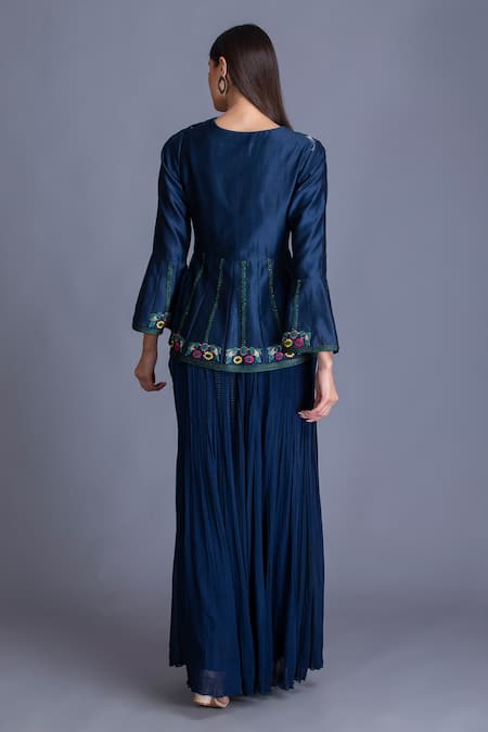 Midnight blue short tunic with floral embroidery and flared sleeves. Comes with crinkled palazzo.