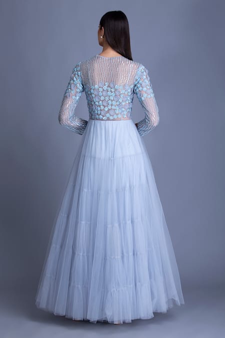 Blue Tulle Cutdana And Thread, Sequin, Beads Round Layered Gown