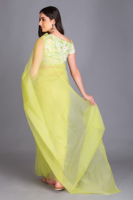 Green sheer saree on a silk organza base. Comes with floral embroidered blouse.