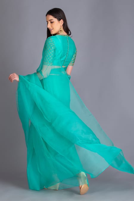 Mint green sheer saree on a silk organza base. Comes with sleeve embroidered blouse.