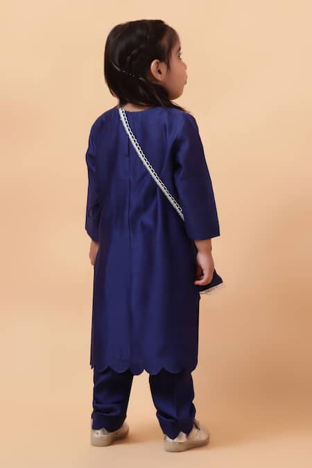 Cobalt blue angrakha kurta featuring unicorn embroidery with sequin, beads, and cutdana. Paired with coordinating pant and a lace detailed sling bag.