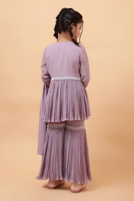 Lilac peplum kurta featuring embroidered unicorn motifs with cutdana and beads. Paired with a pleated sharara and coordinating dupatta adorned with pearl drop tassels.