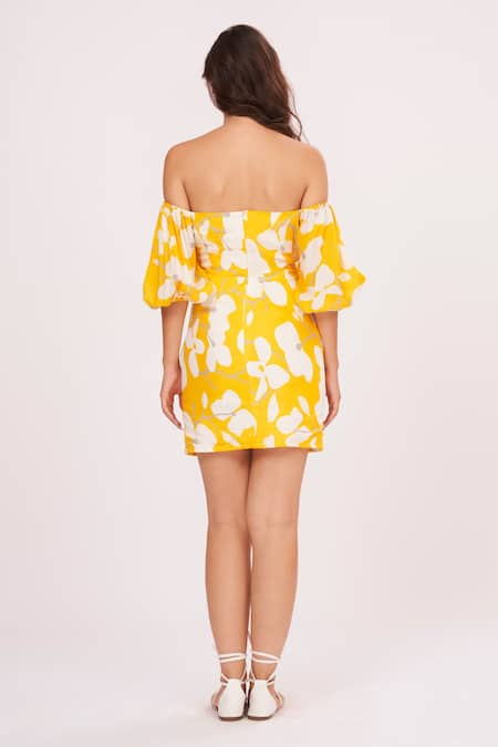 Yellow dress featuring an off-shoulder neckline with puffed sleeves and an abstract print