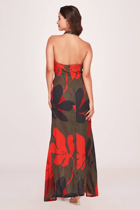 Green Satin Halter Neck Bougainvillea Print Maxi Dress
