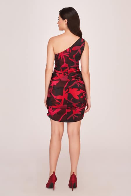 Black and pink one-shoulder floral printed dress in crepe fabric featuring asymmetric sleeves