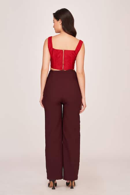 Red panelled corset featuring a square neckline and sleeveless design. Paired with brown trousers that provide a relaxed fit.