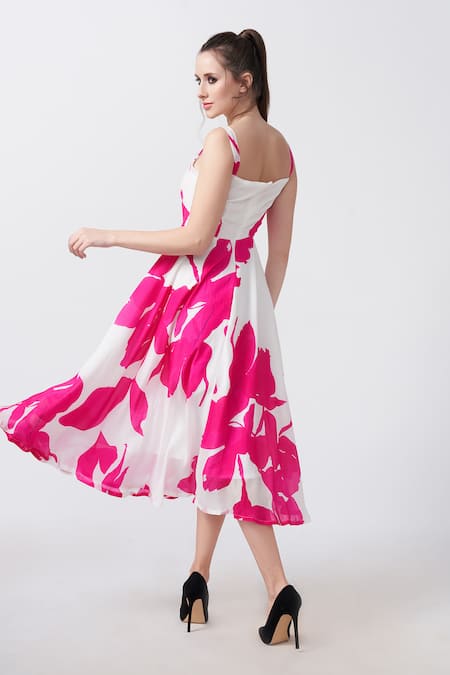 Pink Crepe Sweetheart Neck Peony Bloom Print Midi Dress