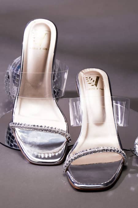 Silver slip-on heels featuring a crystal embellished front strap and back transparent strap. Designed with a high-quality faux leather insole and a unique acrylic transparent strap.