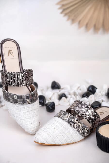 White mules featuring a pointed toe design with delicate woven leather straps and bugle bead embellishments