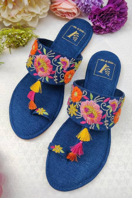 Blue kolhapuri flats featuring floral motifs and pom pom embellishments