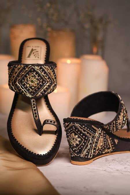 Black kolhapuri wedges featuring a front T-strap and toe-ring design