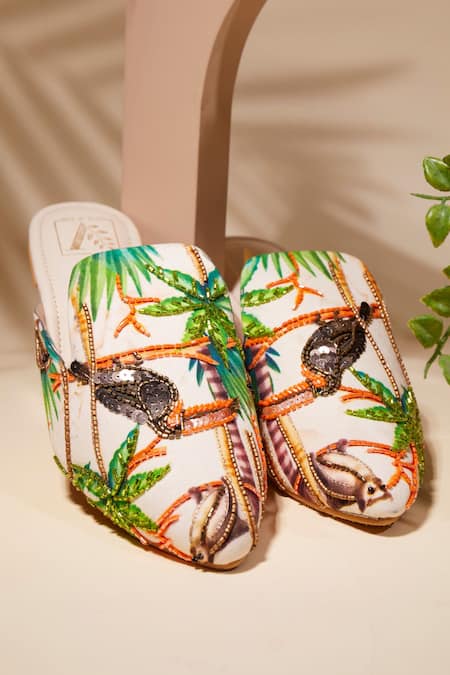 Beige designer mules featuring an intricate hornbill and foliage embroidery