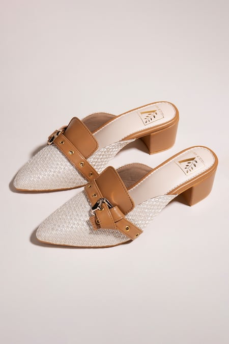 White block heeled mules featuring a basket weave pattern and a buckle strap
