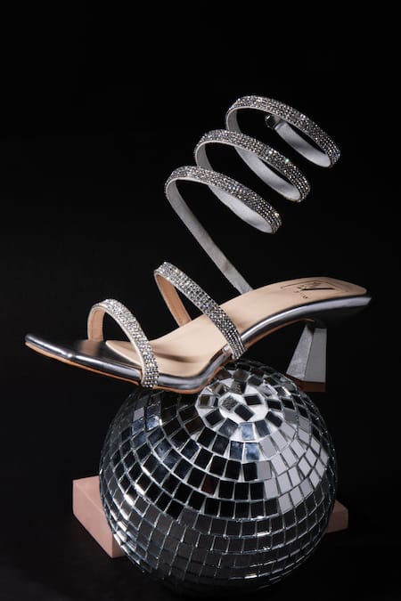 Silver heels featuring swarovski embellished straps and a unique heel design