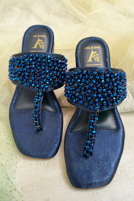 Blue textured satin T-strap flats featuring intricate glass bead embroidery