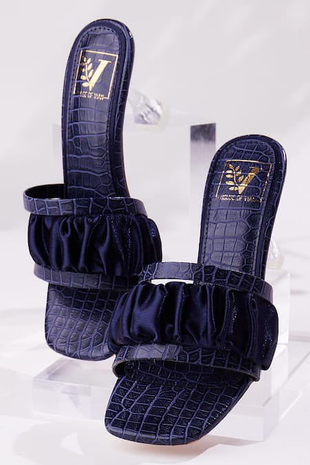Blue ruffle strap pointed heels featuring a faux leather composition