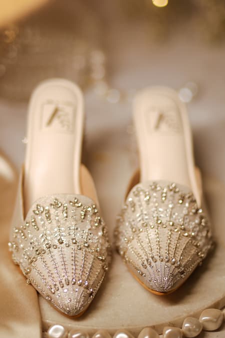 Silver mule heels featuring intricate crystal, cutdana, and sequin embroidery