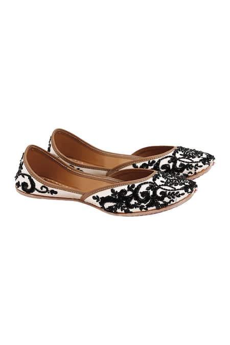 White and black juttis featuring all-over resham embroidery and embellished crystals-beads