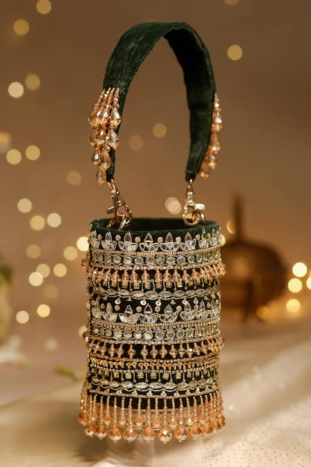Green potli bag crafted from premium velvet featuring intricate mirror, crystal tassel embroidery, and glass bead embellishments in a floral pattern