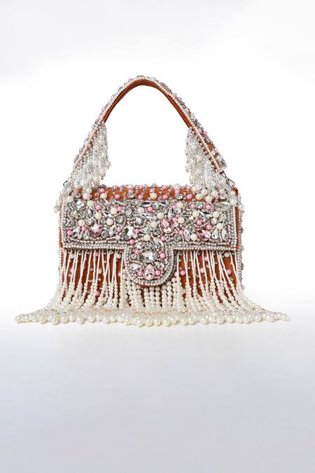 Rust orange box clutch featuring intricate elephant pearl and glass bead embroidery. Comes with a short embroidered handle and tassels for added elegance.
