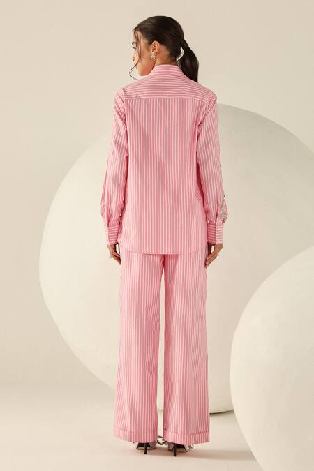 Pink-and-white striped co-ord set featuring a structured button-up shirt. Paired with tailored straight-leg trousers with silver embellishments.