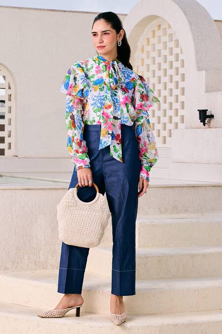 White top featuring multi-color bloom print with peasant sleeves and a tie-up neck. Paired with blue denim pants.