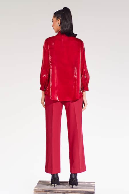 Maroon sheer shirt made from organza featuring long sleeves, a collared neckline, and tie details with rivets
