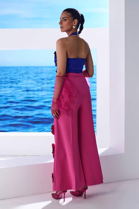 Electric blue top featuring 3D embellished flowers with a halter neck. Paired with an embellished pink flared pant.