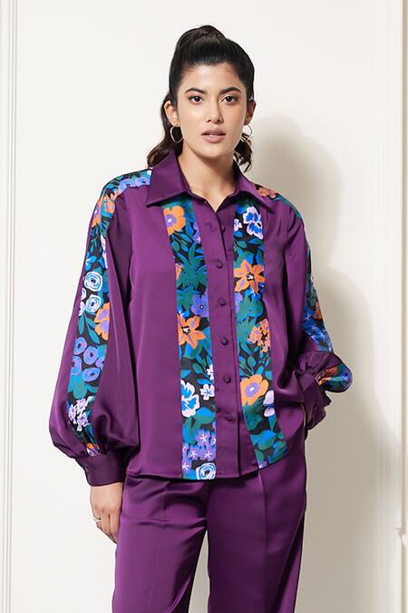 Plum luxury satin shirt featuring floral printed patched panels and puffed sleeves. Paired with matching pant for a complete look.