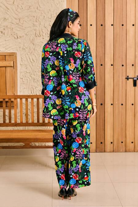 Black Crepe Embroidery Collared Floral Print Shirt And Pant Set